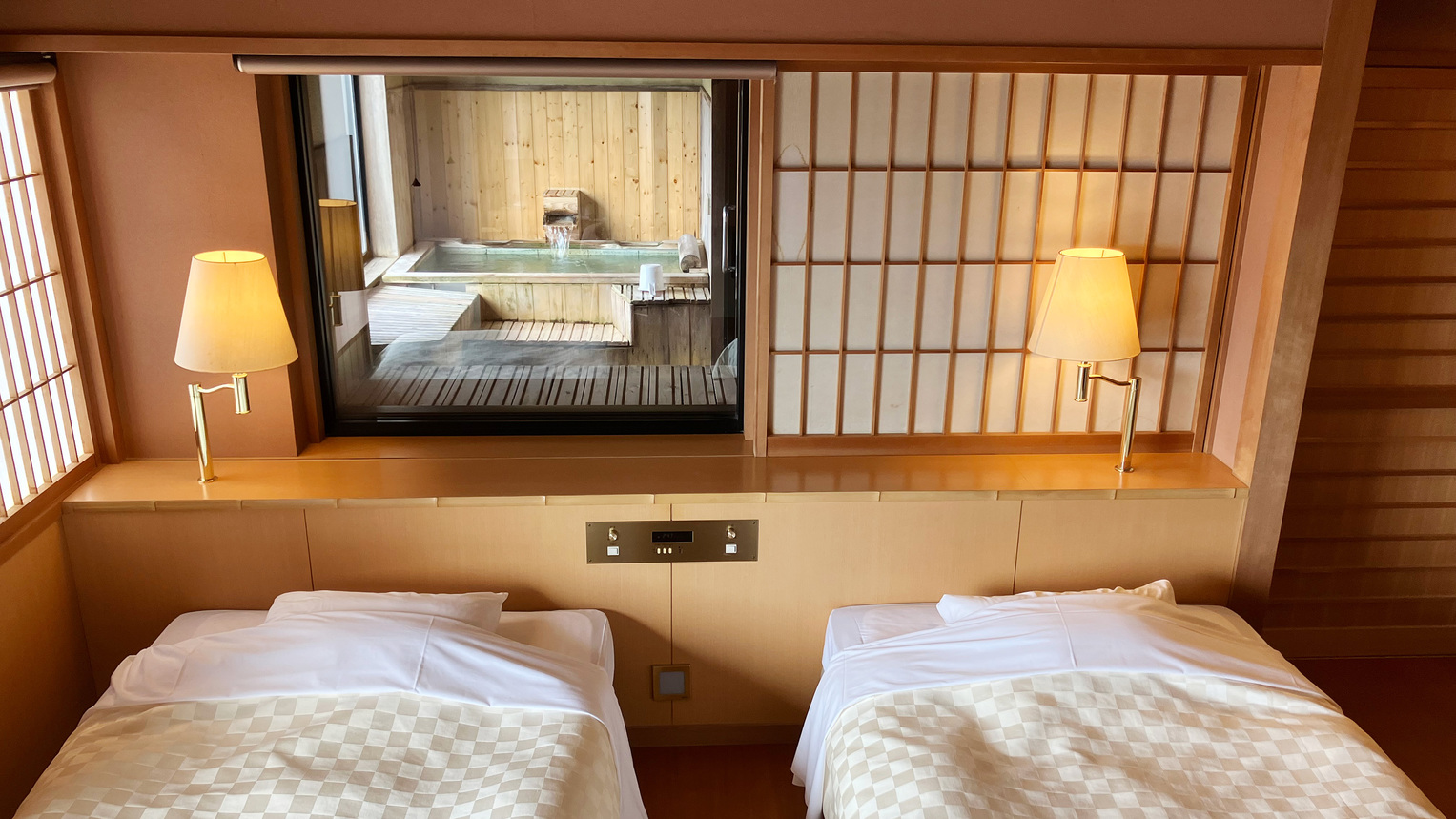 客室露天風呂。「露天」という表記の割には窓がついていて、近隣の建物とのこともあるのか半分程度は簾が下がっているので、「露天風呂」というワードから想像される、開放的なイメージ、外気の冷たさと温泉の暖かさのコントラストが魅力的で、というイメージにはそぐわないが夜中でも早朝でも、自分の好きな時に好きなだけ入ることができて、大浴場に行くときのような貴重品をロッカーに入れてうんぬん、というような煩さしさもないのが、面倒くさがりな私には好都合だった。