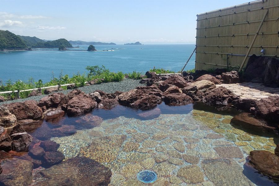 遠くに見えるのは久礼湾の双名島。湯に浸かると、まるで海の上にぷかぷか浮かんでるような気分になります。