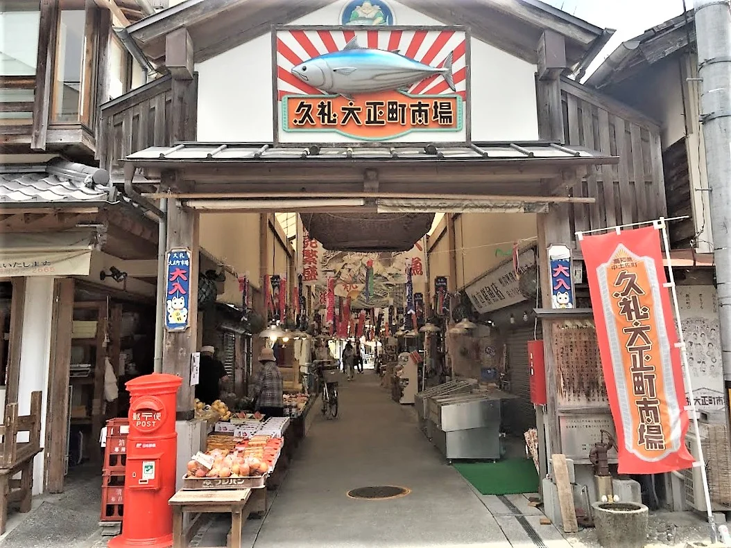 高知県中土佐町にある「久礼大正町市場」は、港町の空気そのままに、朝どれの魚や地元の野菜、果物が並ぶ活気あふれる市場です。