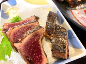 今回は名店「明神丸」のたたきを注文。表面は香ばしく中はレア、薬味をのせてポン酢でいただくと…もうビールが止まらない!