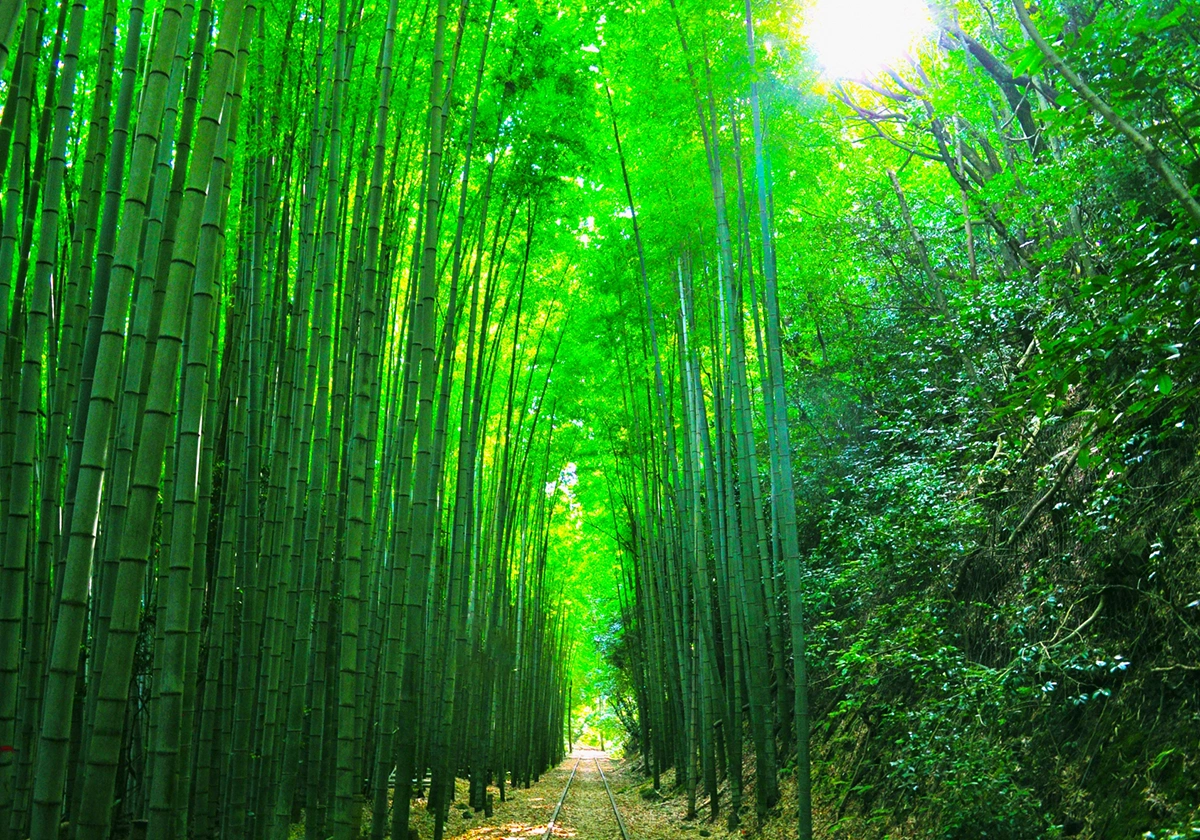 この駅から線路に降りて道沿いを歩いていくと竹林のトンネルへ。
