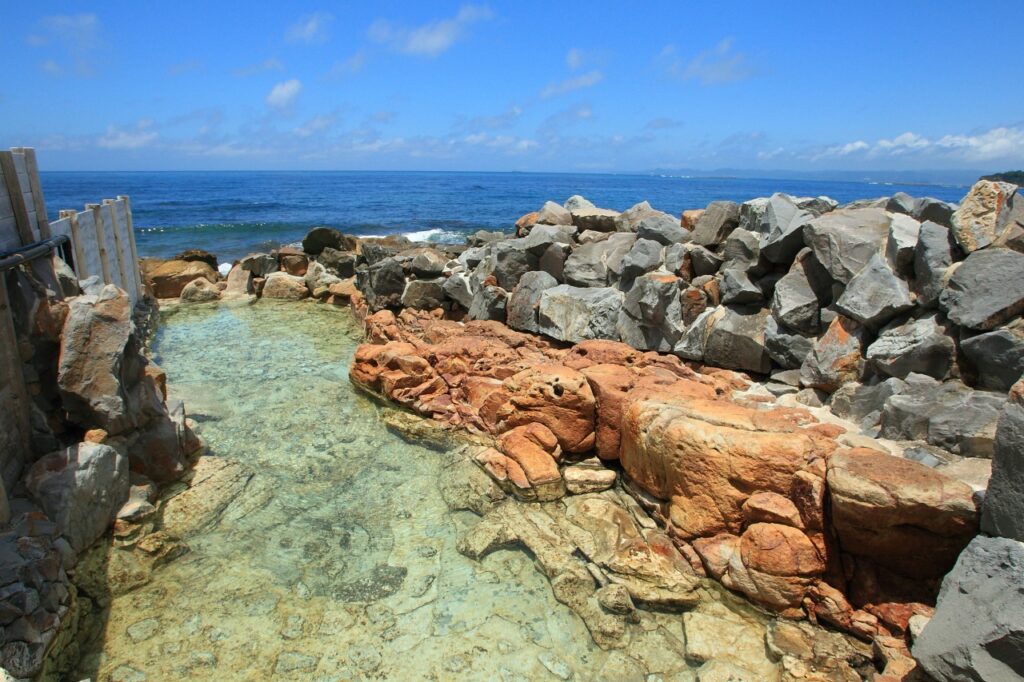Sakinoyu is the only remaining bath from the ancient “Yuzaki Seven Hot Springs” mentioned in the Manyoshu poetry anthology. It features a historic rock-lined outdoor bath just steps from the Pacific Ocean.